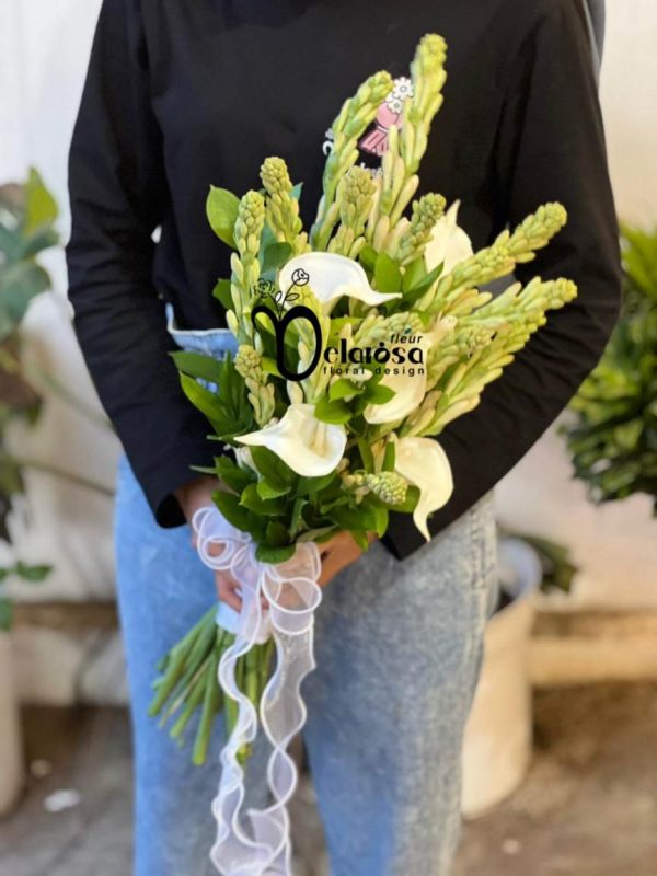 Komponen bunga dikombinasikan pakai bunga artificial calalily putih dan bunga fresh sedap malam