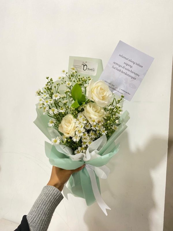 • Bisa pilih warna bunga dan warna wrapping (pembungkus) disesuaikan yang tersedia di studio