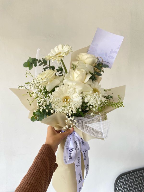 • Disclaimer : Kemiripan hasil jadi produk dengan foto mencapai 80% karena beberapa faktor seperti (1) ketersediaan model dan warna wrapping, (2) ketersediaan jenis dan warna bunga, (3) teknik merangkai setiap florist berbeda, (4) komposisi dan komponen bunga di dalamnya dll