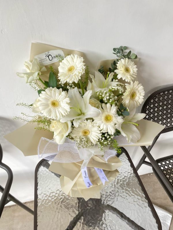 • Disclaimer : Kemiripan hasil jadi produk dengan foto mencapai 80% karena beberapa faktor seperti (1) ketersediaan model dan warna wrapping, (2) ketersediaan jenis dan warna bunga, (3) teknik merangkai setiap florist berbeda, (4) komposisi dan komponen bunga di dalamnya dll